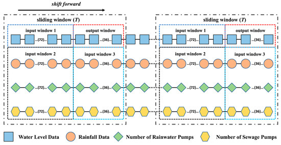 As illustrated in Figure 5, the sliding window in this research has a length of 108, corresponding to 9 h of monitoring data. The sliding window is divided into input window 1, input window 2, input window 3, and output window. By moving forward in time steps of 5 min, the sliding window divides the time series data into input and output combinations of length 108. By applying this process to the data from 1 January 2020 to 17 August 2020, a total of 66,133 training samples can be obtained. In each sample, input window 1 and input window 2 both have a length of 72, containing the water level data for 6 h before the repaired period and the rainfall data, as well as the number of rainwater pumps and sewage pumps, for 6 h before the repaired period, respectively. Input window 3 has a length of 36 and contains the rainfall data, as well as the number of rainwater pumps and sewage pumps, for the repaired period. The output window has a length of 36 and contains the repaired water level data for a 3 h period. The same approach is used to process the test dataset samples.