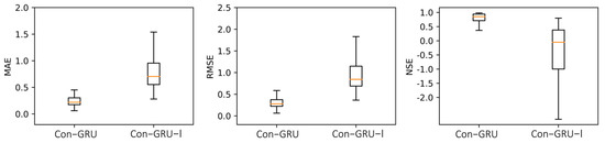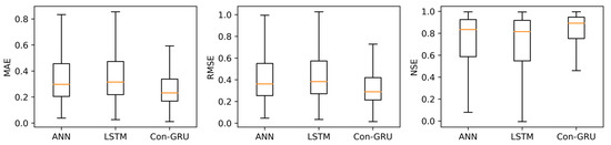 Furthermore, to further analyze the generalization ability of the models, the error distributions of the three indicators are depicted in Figure 7. It can be observed that the Con-GRU model has a better generalization ability compared to the other two models, as indicated by the tight boxes in the box plots. The NSE indicator for most of the samples for the three models is above 0.5, indicating that the models have a certain level of stability in repairing the water level data.