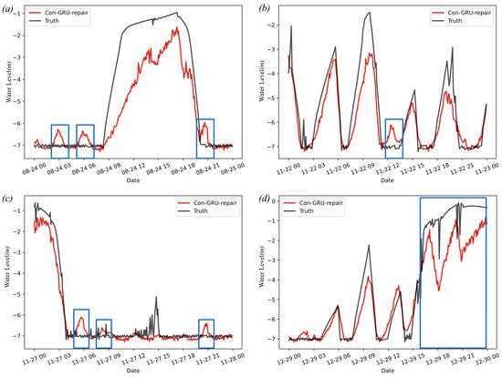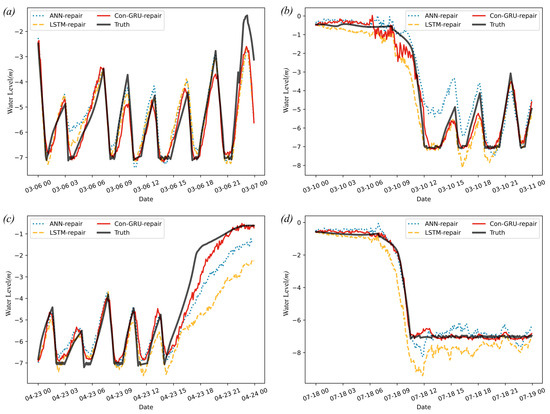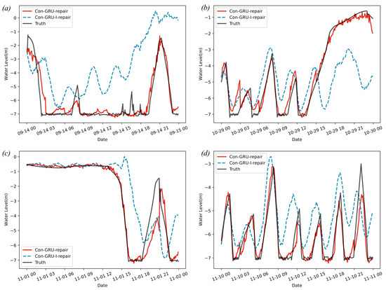 Similarly, such properties also exist in Figure 9b–d, where the NSE of the three cases are 0.8174, 0.9573, and 0.7981, respectively. Further analysis of the difference between the repaired data and the real monitoring data in Figure 9d shows that in the real situation, a sewage pump was turned on at 17:10 and lasted until 17:50. The real monitoring data did not reflect the drop of the water level, but the repaired data of the Con-GRU model can perfectly reflect it. The repaired water level data dropped from −2.096 m to −4.098 m during 17:10–17:50, which is in line with the characteristics of the water level change in the opened pump state. After that, from 18:20 to 20:15, the previously opened sewage pump was turned off under real conditions, and during this period, it was in the rainfall stage. The water level in the repaired data also increased from −4.065 m to −1.099 m, which was more consistent with the change mode compared with the real water level data. Then, from 20:20 to 20:50, another sewage pump was turned on according to the real scheduling situation, and the repaired water level data also dropped from −1.555 m to −3.061 m. Finally, in the real situation, the pump was closed, and the repaired water level data continued to rise on the basis of −3.061 m.