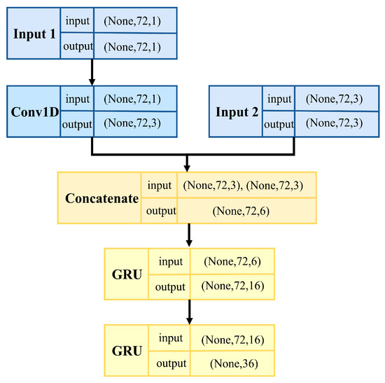 Figure 6 not only illustrates the structure of the Con-GRU model, but also shows the data shape of the input and output for each layer of the model. It can be seen that the Con-GRU model has three input layers, corresponding to the data from input window 1, input window 2, and input window 3, as described in Section 3.3.