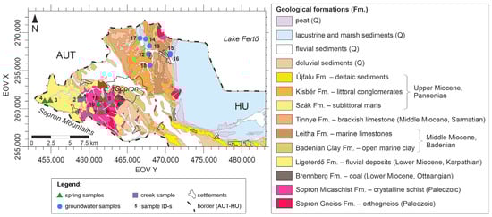 Metamorphic rocks generally have poor hydraulic conductivity (10−10–10−13 m s−1), but the presence of fractures results in an increase in their conductivity (10−4–10−8 m s−1) [67]. Due to multiple metamorphic events and recent weathering processes, the metamorphic rocks in the Sopron Mountains are highly fractured [68]. Numerous springs can be found in the Sopron Mountains that emerge from the weathered and fractured metamorphic rocks or the Miocene to Quaternary siliciclastic sediment cover. Groundwater can penetrate in shallow depths (15–25 m); thus, the springs are characterised by fluctuating discharge rates, low temperature, and low total dissolved solid content [68,69].