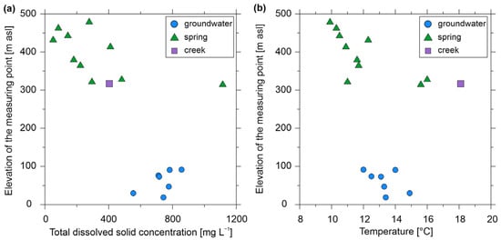 (a) Total dissolved solids of the samples as a function of the elevation of the measuring point. (b) Temperature values of the samples as a function of the elevation of the measuring point.