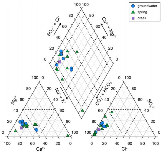 Water samples from springs and wells have different characteristics. Table S1 of the Supplementary Materials contains all the measured parameters. Spring waters have low mineralisation (108−697 𝜇S cm−1), with one exception (sample nr. 1, 1609 𝜇S cm−1). Creek water has similarly low specific electric conductivity (552 μS cm−1). Groundwater samples taken from wells have EC values within the range of 708−1198 𝜇S cm−1. Since the total dissolved solids content (TDS) of the water positively correlates with the EC values measured in the water, well water has higher TDS (554−857 mg L−1) than spring water (52−482 mg L−1) (Figure 4a). Spring sample nr. 1 has remarkably higher TDS than other springs (1115 mg L−1), which could be explained by local anthropogenic causes (design of the spring orifice, contamination by tourism, or use of road salt), given its relatively high Cl−, SO42−, K+, and Na+ contents (see Table S1 of the Supplementary Materials).