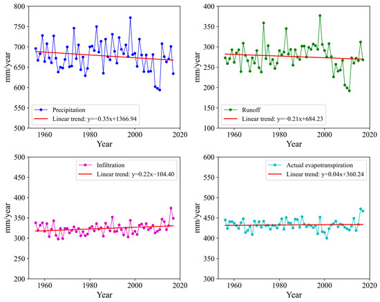 This study comprehensively presented the trends and spatial patterns of key hydrological variables in China over more than half a century. We have demonstrated that the four key hydrological variables (P, R, Inf, and ETa) have followed spatial patterns of gradually increasing from the northwest to the southeast. Over 62 years, the key hydrological variables in different regions have revealed complex tendencies. The hydrological variables in the northwestern region have shown a concentrated and large-scale increasing trend, which we attributed to an increase in water availability caused by climate change. In the southeast coastal area, the increase in P contributed to the increase in the R and Inf, whereas ETa has dropped unexpectedly as a result of the reduction of vegetation area.