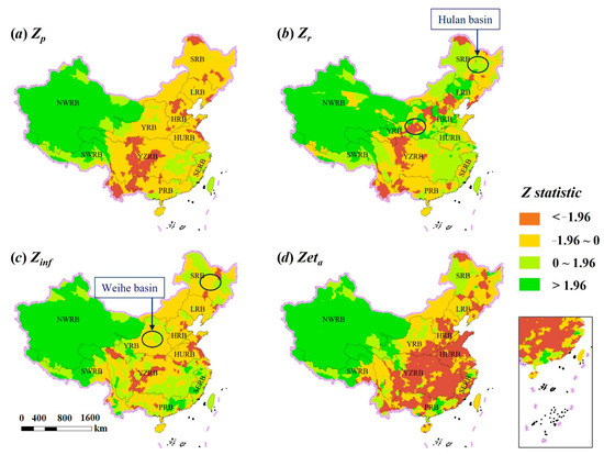 Spatial pattern of results for M-K trend test. (a) Zp, (b) Zr, (c) Zinf, (d) Zeta.