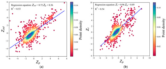 Linear regression relationship and point density distribution map. (a): Linear regression relationship between Zinf and Zp; (b): Linear regression relationship between Zr and Zp.