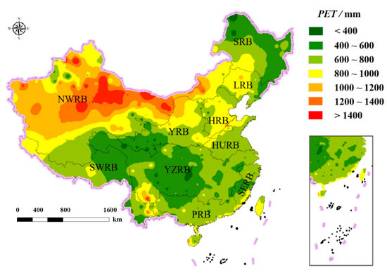 Figure 7 shows the spatial pattern of the long-term mean of potential evapotranspiration (PET), which is the potential rate when sufficient water is available [63]. The spatial pattern of PET in China (Figure 7) followed the opposite spatial pattern of ETa (Figure 3d), which indicated that water availability had played a critical role in constraining ETa. This constraint, however, differed in the southern and northern regions. The results of the t-test for the correlation between ETa and P showed that both variables had a significant correlation at the 0.01 confidence level in northern China (SRB, LRB, HRB, HURB, YRB, and NWRB) and southern China (SWRB, YZRB, SERB, and PRB). The regression coefficient (Figure 8), however, was greater in the north (0.78) than in the south (0.57). This means that P in the north placed a greater constraint on ETa than it did in the south. This finding was consistent with the perspective [64] that the north has water-limited ETa and the south has energy-limited ETa based on the concept of the Budyko framework [65].