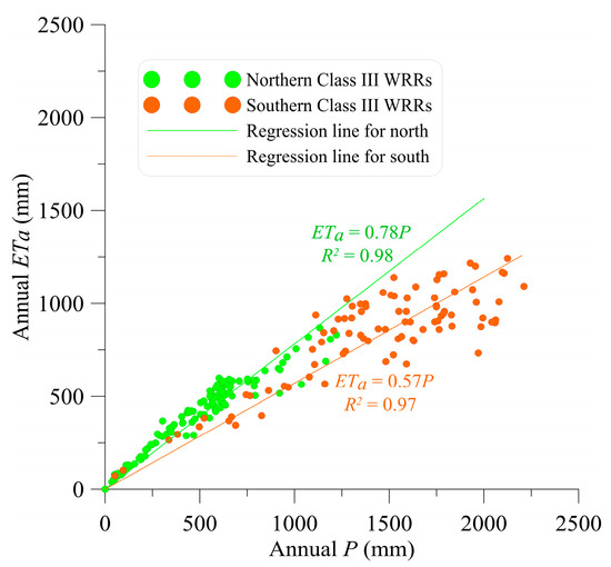 Linear regression relationship between ETa and P in north and in south Class III WRRs. R2 is the goodness of fit.