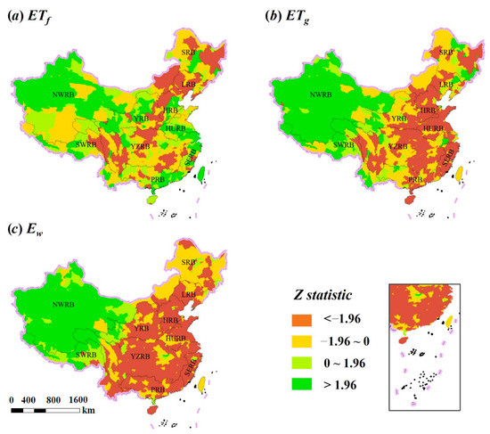 Spatial distribution of M-K trend test for (a) ETf, (b) ETg, and (c) Ew; ET is evapotranspiration and E is the evaporation; Subscript f, g, w means forest, grassland, and surface waterbody respectively.
