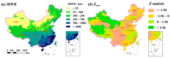 In the spatial distribution of the Class III WRR scale, IRWRs gradually increased from northwest to southeast (Figure 10). The IRWRd of the northwestern region and the northern region adjacent to Mongolia was below 100 mm. The IRWRd of the northeast region was between 100 mm and 250 mm, but the IRWRd of the coastal areas was significantly higher than that of other areas, up to 700 mm. The southeast region had the most abundant IRWRd, with an average annual value of about 1000 mm. In terms of time evolution, the IRWRd of HRB, SWRB, upper-middle stream of YZRB, and SRB decreased significantly (Zirwr ≤ 1.96), which likely was caused by the combined effects of climate factor and underlying surface change. The IRWRd of NWRB showed a significant increasing trend (Zirwr > 1.96), possibly because of the melting of glaciers and the thawing of frozen soil.