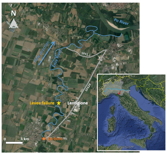 Study area of Enza River from the gauged station of Sorbolo to the confluence with the Po River. The village of Lentigione and the location of the levee failure are illustrated.