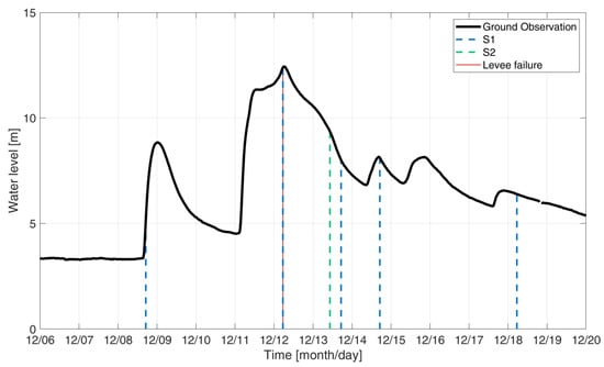 Discharge hydrograph recorded at Sorbolo gauged section. The occurrence time of the levee breach and the satellite images (S1, Sentinel-1; S2, Sentinel-2) available during the event.