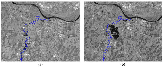 Two Sentinel-1 images were selected to study the flood event: (1) Sentinel-1A GRD in VV polarization, descending, acquired on 12 December 2017 at 5:27 a.m. (Figure 3a); (2) Sentinel-1A GRD in VV polarization, ascending, acquired on 13 December 2017 at 5:15 p.m. (Figure 3b).