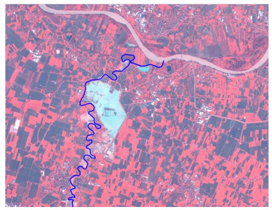 Sentinel-2A, descending, acquired on 13th December 2017 at 10:24 a.m. The representation is R: NIR; G: Green; B: Blu. In blue, the shapefile of the river is also illustrated.