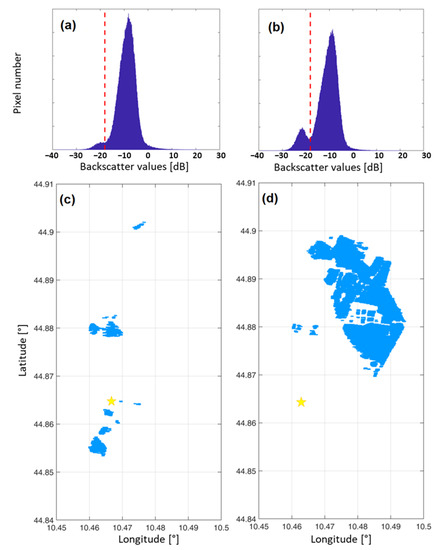 For the SAR images, the histogram threshold [25] is a consolidated approach used to discriminate between flooded and non-flooded areas, using the radiometric distributions of water bodies and other land-use types.