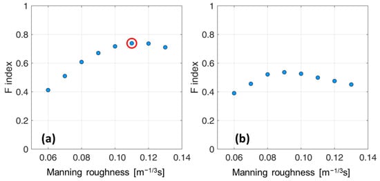 Variability of the measure of fit F as a function of the Manning roughness coefficient calculated with respect to the (a) satellite optical image acquired on 13th December 2017 at 10:24 a.m. and (b) SAR image acquired on 13th December 2017 at 5:15 p.m. Red circle in the subplot (a) highlights the optimal manning roughness coefficient selected for the analysis.