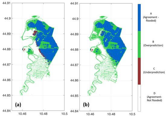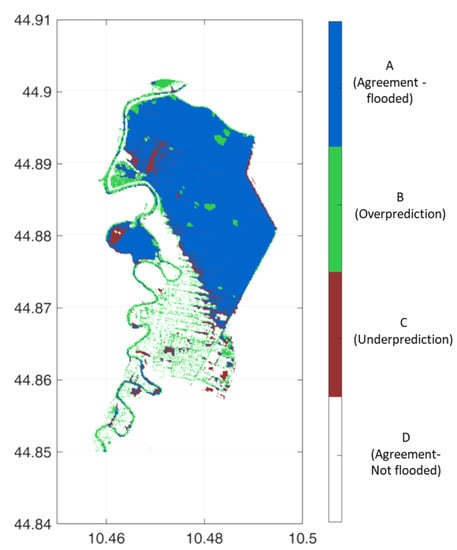 The comparison between each simulated flood scenario and the satellite-derived maps at the same time step was performed using the procedure proposed by Aronica et al. [36], based on the index F, which represents the measure of the overlap between the observed and computed flooded areas, as follows: