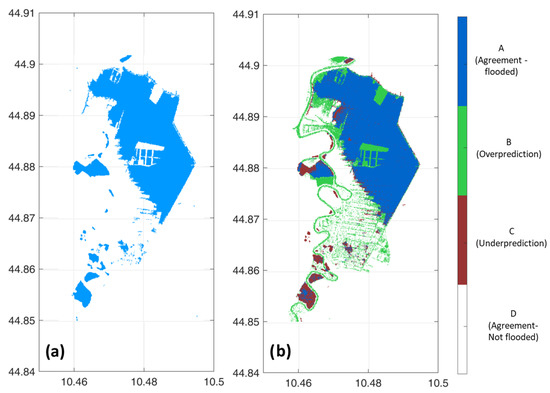 Flooded area extracted from the Copernicus Emergency Service for the event classified as EMSR260 in Cicognara, Sorbolo and Sant Ilario d’Enza [32] (a) and its comparison with the flood map derived from Wec-Flood model simulation with n = 0.10 m−1/3s (b).