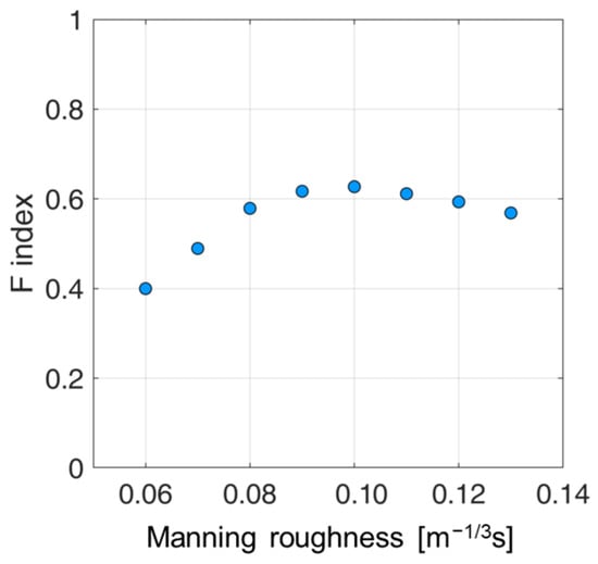 where A is the amount of wet area correctly predicted by the hydraulic model, B is the area predicted to be wet that is instead observed dry (overprediction) and C is the wet area not predicted by the model (underprediction). F ranges from 0 to 1; if it is equal to 1, observed and predicted areas exactly match, and if it is equal to 0, there is no overlap between the predicted and observed areas. Therefore, maximising F allows one to estimate the optimal value of n for which the simulated flooded area is as close as possible to the observed one [37].