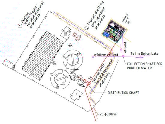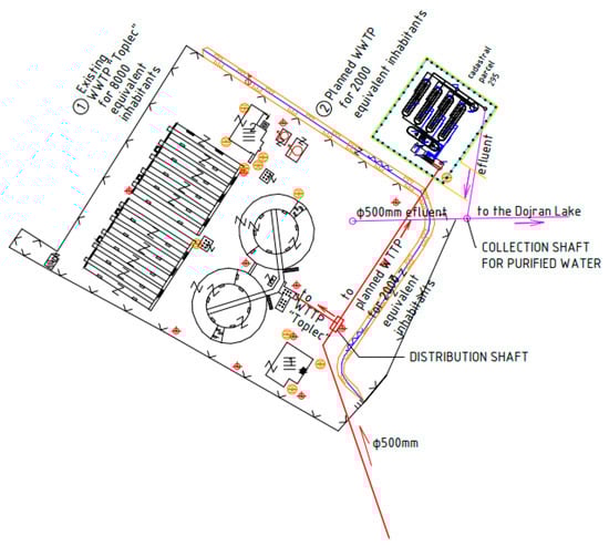 The new treatment plant would be located next to the existing one, as presented in Figure 2. It is envisaged that the water will be directed to the distribution shaft equipped with valves via the last pumping station of the main collector system, from which one line would lead to the existing WWTP and the other line would lead to the new station. The area (about 900 m2) where the new treatment station is installed is part of the private plot KP295, and it should be subject to expropriation.