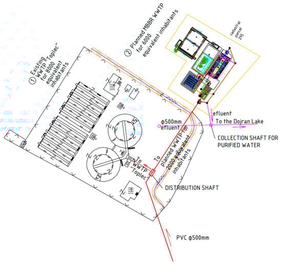 As the calculations of the equivalent inhabitants confirm, due to the fact that Dojran is a tourist center, there are large variations in wastewater emissions during the year. Therefore, in order to achieve greater efficiency and economy, it is planned to build a new plant that would operate throughout the year and serve the permanent residents of the municipality of Dojran, while during the tourist season, in accordance with the reconstruction project, the existing WWTP would also be activated []. Variant 1 is presented in Figure 1.