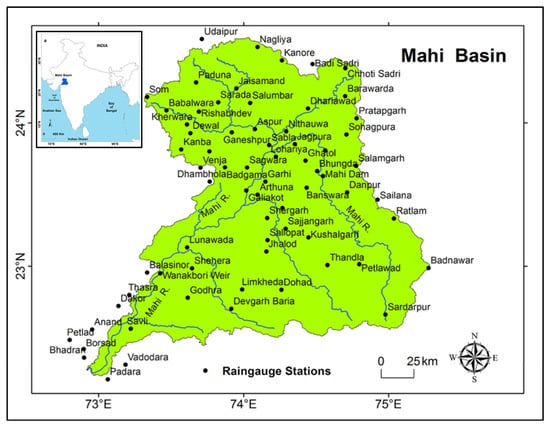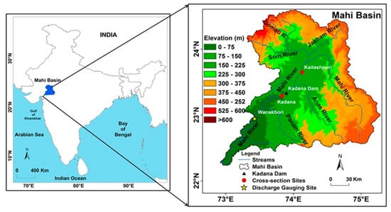 The Mahi River is the third largest interstate west-flowing river in India (refer to Figure 1). The river originates near the Minda village of the Sardarpur tehsil in the Dhar district (Madhya Pradesh) at an elevation of 580 m. It flows for a length of 583 km and meets the Gulf of Khambhat in Gujarat. The Som River, the Jakham River, the Anas River, and the Panam River are the major tributaries of the Mahi River (Figure 1). The Mahi Basin extends between 22°12′55″ to 24°35′22″ N latitudes and 72°46′11″ to 75°16′55″ E longitudes []. The drainage area of the basin is 34,842 km2. It covers 19.22% of the area of Madhya Pradesh, 47.22% area of Rajasthan, and 33.56% of the area of Gujarat. The annual average rainfall (AAR) of the Mahi Basin is 889 mm. About 97% of the annual rainfall occurs during the monsoon season (June–September). July (33%) is the rainiest month throughout the basin, followed by August (32%). The basin contains two climatic regions; the northern part of the basin comprises a subtropical wet climate in the upper reaches and a tropical wet climate in the lower reaches. The Mahi Basin is significantly influenced by the LPSs that form over either Bay of Bengal or adjoining land and move in western and northwestern directions []. These LPSs are accountable for boosting the rainfall of the Mahi Basin. Table 1 denotes some of the notable flash floods in the Mahi Basin in the past (1901–2020). The geology of the Mahi Basin encompasses the rocks of the Deccan Trap (Basalt), the Proterozoic Vindhyan Supergroup (sedimentary and metasedimentary rocks), Aravali Supergroup rocks (Leucogranite intrusion, granites, amphibolites), and Banded Gneissic Complex (BCG) rocks []. The vast area of the basin is occupied mainly by red and black soils. The maximum area of the basin is covered by finely textured soils (65.60%), followed by rocks and non-soil, accounting for 12.96% []. According to Patle et al. [], agriculture is the most dominant land use land cover in the Mahi Basin (65% of the area), followed by 11% forest cover and about 2.9% taken up by water bodies.