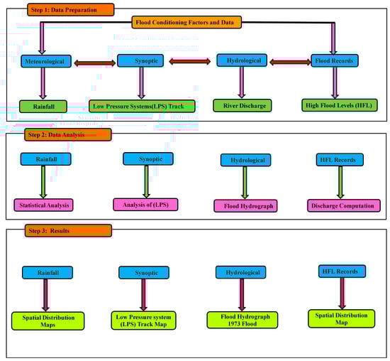 Flow chart of the methodology used for hydro-meteorological analysis of 1973 flood.