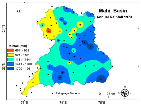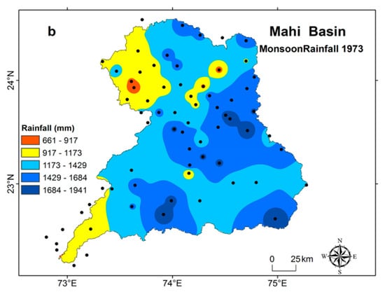 Spatial distribution of (a) annual rainfall; (b) monsoon rainfall in the Mahi Basin in 1973.
