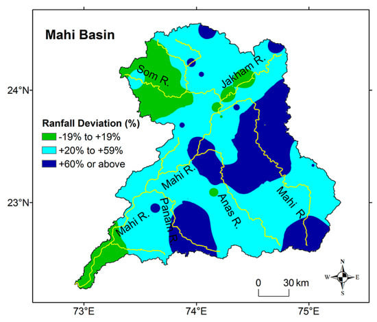 Spatio-temporal distribution of annual rainfall showed that annual rainfall of the Mahi Basin varied between 661 mm (at Dewal) and 1961 mm (at Danpur) during 1973 (Figure 2 and Figure 4a). In 1973, the AAR of the Mahi Basin was 1334 mm, which was about 50% more than the AAR (889 mm) of the basin. The minimum and maximum monsoon rainfall observed for the Dewal (661 mm) and Danpur (1961 mm) are shown in Figure 2 and Figure 4b. The Dewal, Danpur Babalwara, Badgama, Balasinor, Barawarda, Bhungra, Dohad, Galiakot, Godhra, Jagpura, Kanba, and Kanore stations received 100% annual rainfall from June to September (monsoon season) in 1973 (Figure 2 and Figure 4a,b). Moreover, the annual (monsoon) rainfall deviation was 327 mm (324), and rainfall variability was 24% (annual) and 25% (monsoon) in 1973. Analysis of percent deviation from the mean monsoon rainfall of the Mahi Basin showed that the Sardarpur, Danpur, Mahi Dam, Bhungda, Salamgarh, Kushalgarh, Sajjangarh, Galiakot, Limkheda, and Devgarh Baria stations recorded excessive (+60% and above) monsoon rainfall in 1973. (Figure 2 and Figure 5). During the 1973 monsoon season, the western, central northern, and lower basins received normal rainfall (−19% to +19%). Nevertheless, most of the Mahi Basin received excess rainfall (+20% to +59%) during the 1973 monsoon because of the impact of synoptic conditions (Figure 5).