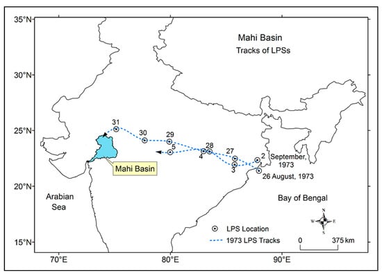 In 1973, the catastrophic flood of the Mahi Basin was widespread and associated with LPSs. The prominent synoptic conditions are depressions (D) formed over the Bay of Bengal and adjoining headland region from 26 to 31 August 1973 and 2 to 5 September 1973 (Figure 6). The first LPS formed as a monsoon low over the North Bay of Bengal on 24 August, became a depression on the morning of 26 August, and crossed the coast south of Balasore. It became a deep depression (DD) on 27 August, near Jamshedpur. The depression moved northwest across north Madhya Pradesh from 28 to 31 August and weakened into a low depression on the morning of 1 September over south Rajasthan. The monsoon low persisted over south Rajasthan until the morning of 3 September 1793, and merged with the monsoon trough [,,].
