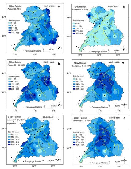 The spatiotemporal rainfall characteristics of the Mahi Basin are significantly determined by the monsoon rainfall (June–September). The monsoon rainfall varies between 661 mm (at Dewal) and 1961 mm (at Danpur). The 1973 catastrophic flood was associated with chronological LPSs that produced heavy to very heavy rainfall over the Mahi Basin. As a result, most of the Mahi Basin received excess rainfall (+20% to +59%) in the 1973 monsoon season. Nevertheless, the annual rainfall of the basin was about 50% more than the normal annual rainfall (889 mm) in 1973. Some of the stations’ monsoon rainfall was above 60%, such as Sardarpur, Danpur, Mahi Dam, Bhungda, Salamgarh, Kushalgarh, Sajjangarh, Galiakot, Limkheda, and Devgarh Baria. Extremely heavy rainfall spells were observed at Bhungda (254 mm), Shergarh (249 mm), and Mahi Dam (247 mm), under the influence of the second LPS. Heavy to extremely heavy rainfall in the upper catchment of the basin on 7 and 8 September produced a catastrophic flood in the Mahi Basin. One of the notable impacts of 1973 was observed at Kailashpuri, where the slabs and pillars of the bridge were washed out and observed at a 50–60 m distance from the present pillars of the bridge. The catastrophic flood caused damage to several settlements and agricultural areas on both the banks of the Mahi River and its tributaries. Therefore, this study has significance for future flood disaster management and hydraulic structure construction in the Mahi Basin.