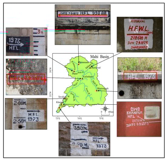 Long-term and well-documented historical flood records for the Mahi Rivers are not available. Besides, systematic discharge records at gauging sites in the Mahi Basin are short (30 to 40 years), except at Wanakbori (57 years). Long-term (1959–2016) AMS data of the Mahi River are available only for the Wanakbori site. Therefore, very little information about the 1973 flood on the Mahi River is available. Fieldwork and surveys were conducted to obtain more information about the 1973 flood. High flood level (HFL) marks of 1973 were observed at Bhairongarh, Kailashpuri, Sevaliya, Khanpur, and Vasad (Figure 8). Besides, HFL evidence of the 1973 flood was observed on the Som River at Depur, the Gomati River at Jaisamand Dam, and the Jakham River at Dhariawad (Figure 8).