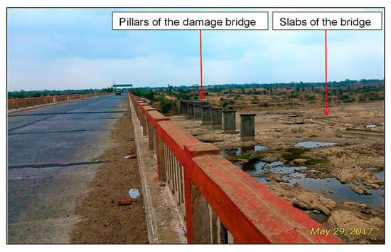 One of the significant effects of the 1973 flood was noticed at Kailashpuri, where a newly constructed bridge (1972) on the Banswara–Sagwara highway was washed out due to a large discharge of 21,553 m3/s on 7 September 1973 (Figure 11). A low level of the bridge and less spacing between two pillars caused damages to the bridge due to high magnitude discharges and uprooted trees in the flows. The slabs and pillars of the bridge were observed at a 50–60 m distance from the present pillars of the bridge. This suggests the importance of accurate estimation of design flood for hydraulic structures. Besides, the 1973 flood caused damage to several settlements and agriculture on both the banks of the Mahi River and its tributaries.