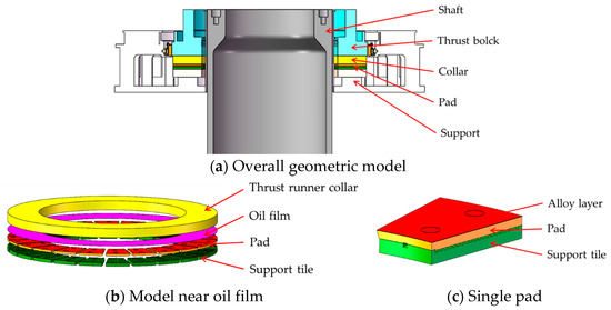 Based on the thrust bearing model (as shown in Figure 2) of the mixed flow water turbine unit of the Baihetan Power Station, a non-deviation model including the shaft, thrust block, collar, pads, and support components is established, as shown in Figure 3a. The oil film is located between the pads and the collar, as shown in Figure 3b. The support tiles are placed on the pads, as shown in Figure 3c. They are a type of multi-oil groove support tile, supporting the force of the pad; they play an important role in the deformation of the pad and thus affect the operation performance of the thrust bearing. The pad has an alloy layer on top, the material of which is Babbitt alloy. Babbitt alloy is a kind of bearing alloy with antifriction properties that is widely used in large bearing rotating machinery. There are 24 bearings in a circle; these bear axial forces collectively. The schematic diagram of each size is shown in Figure 4a, and the parameters of each size are shown in Table 1.