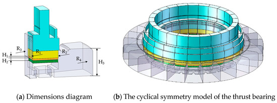 Assuming that the thrust load is distributed on the pad surface evenly, the cyclic symmetry model of the bearing can be established, as shown in Figure 4b; that is, the fluid domain is 1/24 of the lubricating oil in the tank, and solid domain contains a pad, a support tile, and 1/24 of the thrust runner collar.
