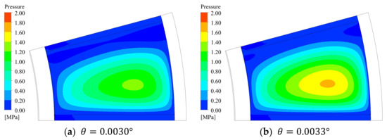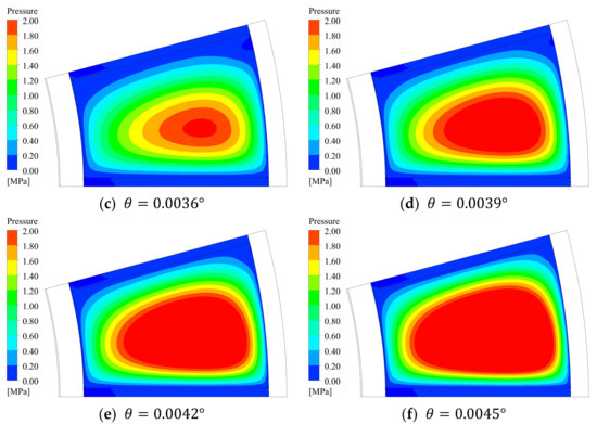 The pressure and temperature distributions also change with the different inclination . The pressure distribution on the collar during operation can be obtained using different angles , as shown in Figure 11. The results show that, on the surface of the collar, the oil pressure increases gradually from the outside to the middle; however, the highest point of the pressure is not in the center but deviates slightly to the rotation direction. With the increase of the inclination , the pressure on the collar surface increases gradually. When the inclination is 0.0045°, the maximum pressure is 3.76 MPa.