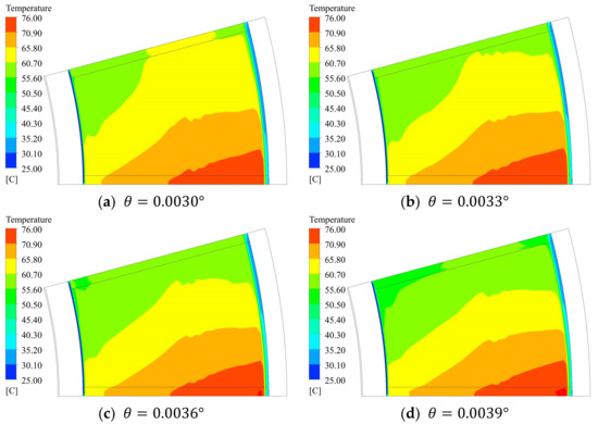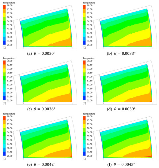 The temperature distribution on the collar is shown in Figure 12. The results show that on the surface of the collar, the temperature increases with the increase of the radius, along the rotation direction; the temperature is the highest on the side near the rotation direction on the outer edge. The temperature increases with the inclination , reaching a maximum temperature of 78.07 °C at the inclination of 0.0045°. When the inclination of the pad increases, the thickness of the oil film decreases, which leads to an increase of pressure in the oil film and a rise in temperature.