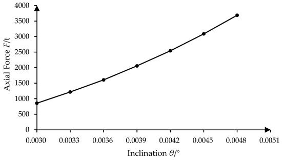 During the rotation of the unit, the wedge-shaped oil film produces an axial force. The axial force varies with the inclination . Through numerical calculation, the variation curve of axial force with inclination is obtained, as shown in Figure 15. With the increase of inclination , the dynamic pressure force increases, so the axial force borne by the thrust bearing increases.