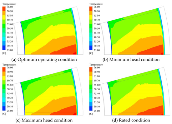 The temperature and pressure distributions of the oil film on the collar are shown in Figure 16 and Figure 17, respectively. The results show that under the optimum operating condition, the maximum pressure of the collar surface is 2.57 MPa, and the maximum temperature is 76.72 °C. Under the minimum head condition, the maximum pressure of the collar surface is 2.40 MPa, and the maximum temperature is 76.49 °C. Under the maximum head condition, the maximum pressure of the collar surface is 2.57 MPa, and the maximum temperature is 76.72 °C. Under the rated condition, the maximum pressure of the collar surface is 2.23 MPa, and the maximum temperature is 76.29 °C.