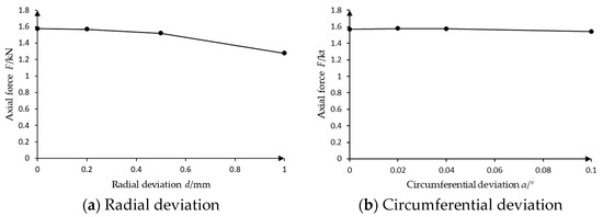 The deviation models of thrust bearings, considering the circumferential deviation and radial deviation , as defined in Figure 9, are numerically calculated. The numerical results show that the axial force of the bearing decreases with the increase of radial installation deviation , as shown in Figure 18a. As the deviation increases, the contact area between the oil film and the pad decreases, and the axial force on the pad decreases. However, the axial force is basically constant with the increase of circumferential deviation , as shown in Figure 18b; the axial deviation has little effect on the contact area.