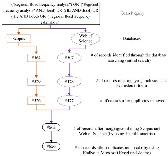 A standard workflow of science mapping in bibliometric analysis has five stages: (1) research design, (2) data collection, (3) data analysis, (4) visualization and (5) interpretation [51]. Peer-reviewed research articles on RFFA studies were obtained from the Web of Science (WoS) and Scopus databases on 9 November 2022 based on the search terms; the inclusion and exclusion criteria are given in Table 1. WoS and Scopus have already been used in bibliometric analysis in different fields either individually [52,53,54] or combined [55,56,57]. The record includes citation information (authors, titles, citation count, etc.), bibliographic information (e.g., affiliations), abstract, keywords and other information (e.g., references).