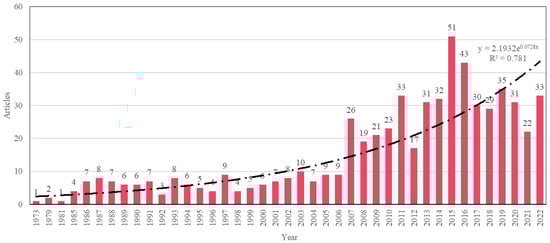 Based on our search, a total of 626 documents were published on the RFFA field between the years 1973 and 2022. The annual publication trend (Figure 2) shows that the number of publications is less than 10 until 2006; in contrast, there is a dramatic peak in 2007. The highest number of publications observed was 51 in 2015, and the annual growth rate was 9.13% between 1973 and 2022.