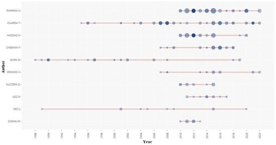 The quantity of an academic researcher’s publications and the number of citations received by a researcher can quantify their research strength and influence of their work [61,62]. Table 3 presents the top 10 contributing authors with the quantity of publications and citations. Australia and Canada are the most dominant countries in terms of the most productive authors. Figure 3 shows the authors’ productivity over time. The horizontal line shows the authors’ active years. Colour density of circles presents the total citations per year (darker colours show higher citations) whereas the size of the circles presents the number of articles. Table 4 lists the most cited articles in RFFA.