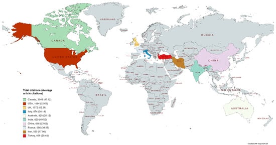 Geographical distribution of the most cited countries. The regions which shown in grey colour are not among the top 10.