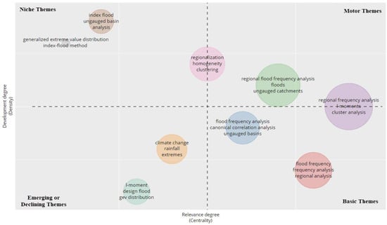 In total, eight clusters were created in the thematic map based on the authors’ keywords. ‘Regional (flood) frequency analysis’ and ‘regionalization’ are placed in the motor themes with high centrality and density. These are developed and essential topics for the study. ‘Index flood’ and ‘generalized extreme value distribution’ were two marginal clusters placed in niche themes. These clusters (or themes) were considered highly developed but isolated. ‘L-moments’ and ‘climate change’ clusters placed in emerging and declining themes were weakly developed and had low centrality and low density. More research is needed in this field. ‘Flood frequency analysis’ and ‘flood frequency’ clusters were placed in the basic themes. These topics showed high centrality (highly relevant) but low density (less developed). The clusters placed in the basic or transversal theme were important for research [54].