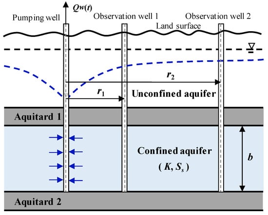 Figure 1 illustrates the proposed conceptual aquifer system. It consists of a fully penetrating pumping well located in a confined aquifer and two observation wells located at radial distances r1 and r2 from the pumping well. The assumptions used in this study are similar to those of the Theis [] model, with the exception that the pumping rate was assumed to vary with time. Several assumptions were made for this study: (1) the confined aquifer was homogeneous, isotropic, and uniformly thick, and had an infinite extent in the radial direction; (2) the initial head of the confined aquifer was uniformly distributed throughout the system; (3) the pumping well had an infinitesimal radius, and hence, the wellbore storage was negligible; (4) groundwater flow was primarily horizontal and followed Darcy’s law; and (5) the water was removed instantaneously as the head declines. The governing equation that describes transient flow toward the fully penetrating pumping well in the confined aquifer can be written as follows []: