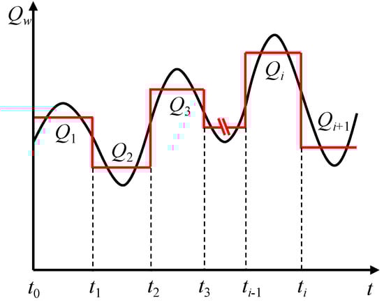 As illustrated in Figure 2, the time-varying pumping rate Qw(t) is represented by a piecewise-constant function, which was approximated by the average pumping rate Qi at each time step. Here, ti represents the inflection time at the junction between the ith and (i + 1)th step of the pumping history. It is worth noting that the initial inflection time was t0 = 0, and the initial average pumping rate was Q0 = 0. To simplify Equation (2), the following dimensionless variables for time and drawdown were introduced: