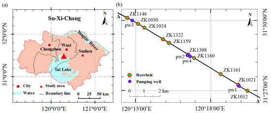 The field site location for the pumping tests. (a) The location of the study area; (b) the locations of boreholes and pumping wells. A–A′ denotes the survey line.