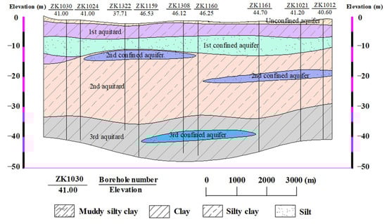 Figure 4b depicts the boreholes and pumping wells in the study area, where A–A′ represents the survey line. The hydrogeological profile obtained from borehole data along A–A′ revealed that the aquifer system in this study area was composed of four aquifers and three aquitards (Figure 5). The sandy silt layers presented in the middle and lower parts of the strata comprised the first, second, and third confined aquifers. These aquifers were recharged through horizontal infiltration of surface water and vertical leakage from the upper unconfined, and discharged through lateral runoff, vertical leakage, and artificial exploitation. The clayey layers overlying and underlying the aquifers served as aquitards with relatively low permeability. From top to bottom, these were identified as the first, second, and third aquitards. Lithological information showed that the void ratio (e) values of the first and second confined aquifers were 0.808 and 0.746, respectively.
