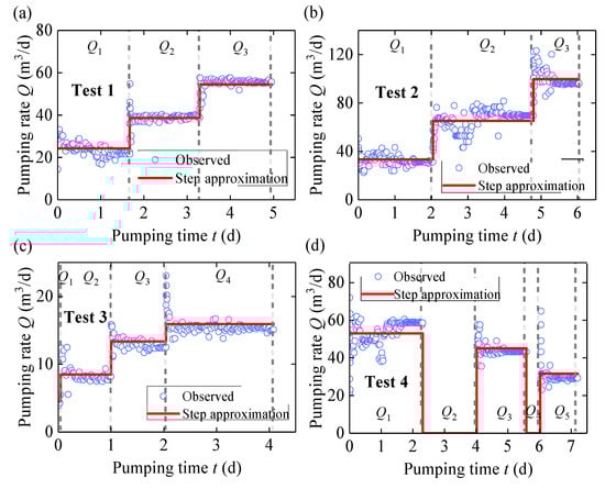 Observed time-varying pumping rates (blue points) and corresponding piecewise-constant or step approximation (red line). (a) First pumping test; (b) Second pumping test; (c) Third pumping test; (d) Fourth pumping test. Qi denotes the average pumping rate of the ith step. Tests 1 and 2 were conducted in the 2nd confined aquifer, and tests 3 and 4 were conducted in the 1st confined aquifer.